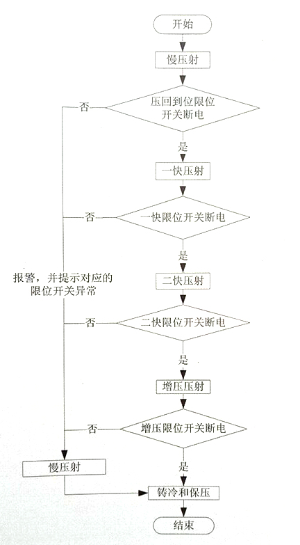 用限位開關(guān)控制壓鑄機(jī)的壓射動作一般包含慢壓射、一快壓射、二快壓射、增壓等。在自動模式下,出現(xiàn)限位開關(guān)異常時,壓射過程只允許執(zhí)行慢壓射動作,其他壓射動作無法啟動,系統(tǒng)的壓力流量使用慢壓射的壓力和流量。壓射限位開關(guān)異常的檢測有:手動模式下,沒有壓射或壓回動作下,壓射(壓回到位,一快位,二快位,增壓位等)限位開關(guān)未發(fā)訊,或者正大壓射或壓回時限位開關(guān)異常,則異常成立。自動模式下,不是壓射或壓回時,限位開關(guān)異常,或者壓射超時間或壓回動作下,壓射(壓回到位,一快位,二快位,增壓位,跟出位)限位開關(guān)未發(fā)訊,異常成立。圖2展示了以上壓射位開關(guān)異常的一種情況,即壓射過程中限位開關(guān)故障的檢測和壓鑄機(jī)動作的控制流程。異常處理方法:異常接觸后,壓鑄機(jī)務(wù)必切換為手動模式,查看人機(jī)界面的報警信息,提示可能含“壓回到位接近開關(guān)故障”,“一快接近開關(guān)故障”,“二快接近開關(guān)故障”,“增壓接近開關(guān)故障”的一種或者幾種。檢查對應(yīng)的限位開關(guān),使故障的限位開關(guān)重新得電,把報警復(fù)位并在手動模式下把壓鑄機(jī)控制回原位。