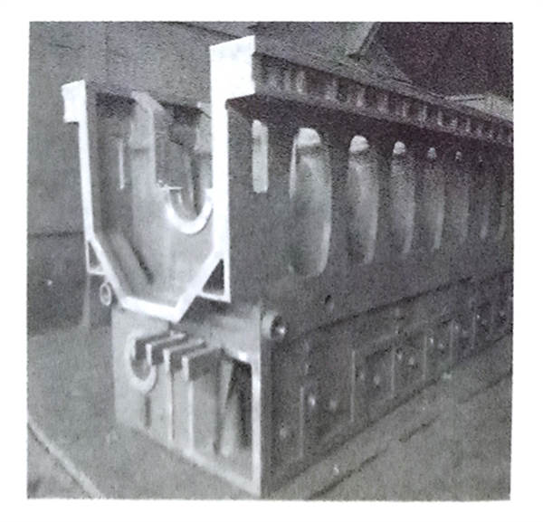 國內(nèi)整體精密鑄造水平相對落后,高精端的球墨鑄鐵鑄件研究和生產(chǎn)仍然是難題,尤其是原材料及工藝控制方面能力仍然較差,目前還未形成大規(guī)模百噸級球墨鑄鐵鑄件的生產(chǎn)能力。國內(nèi)幾個(gè)規(guī)模較大的球墨鑄鐵鑄件廠商主要以風(fēng)電鑄件研究為主(圖2、圖3)。同時(shí)部分廠商也在重型燃機(jī)氣缸鑄件、船用柴油機(jī)機(jī)體鑄件(圖4)、水泵機(jī)座鑄件等高端球墨鑄件件領(lǐng)域取得了重大生產(chǎn)和研究成果。